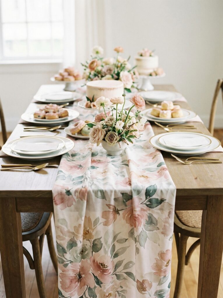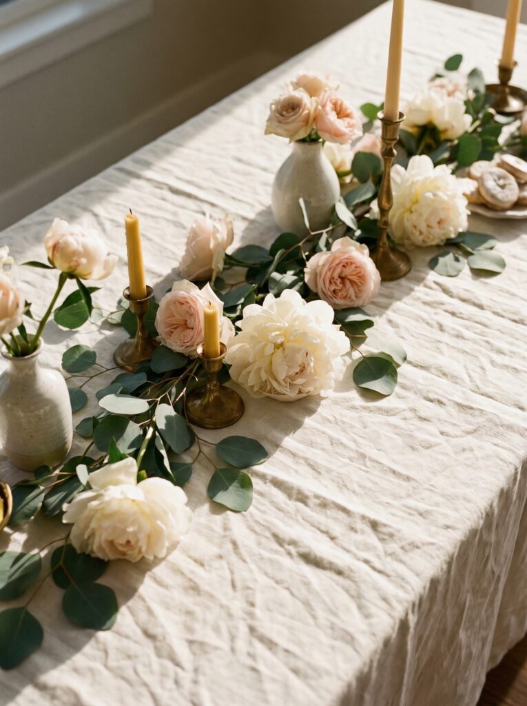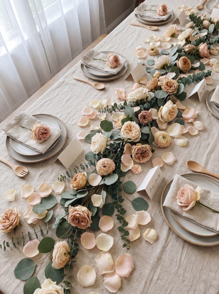 Once your tablecloth and runner are in place, add a loose layer of petal scatter or trailing greenery. This is the detail that takes a table from “nicely set” to “effortlessly abundant.” Scatter loose rose petals, dried lavender buds, or individual flower heads in your palette colors. Lay trailing eucalyptus stems or ivy vines down the center of the runner. The effect is lush without requiring a florist — you can source most of this from your local grocery store.
