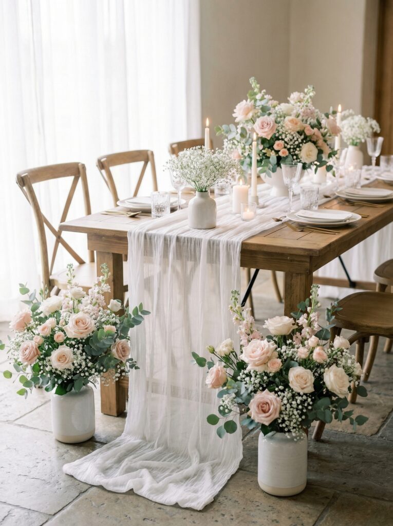 - Gauze or cheesecloth runners for a romantic, ethereal feel
