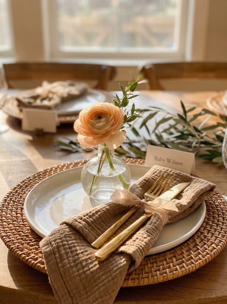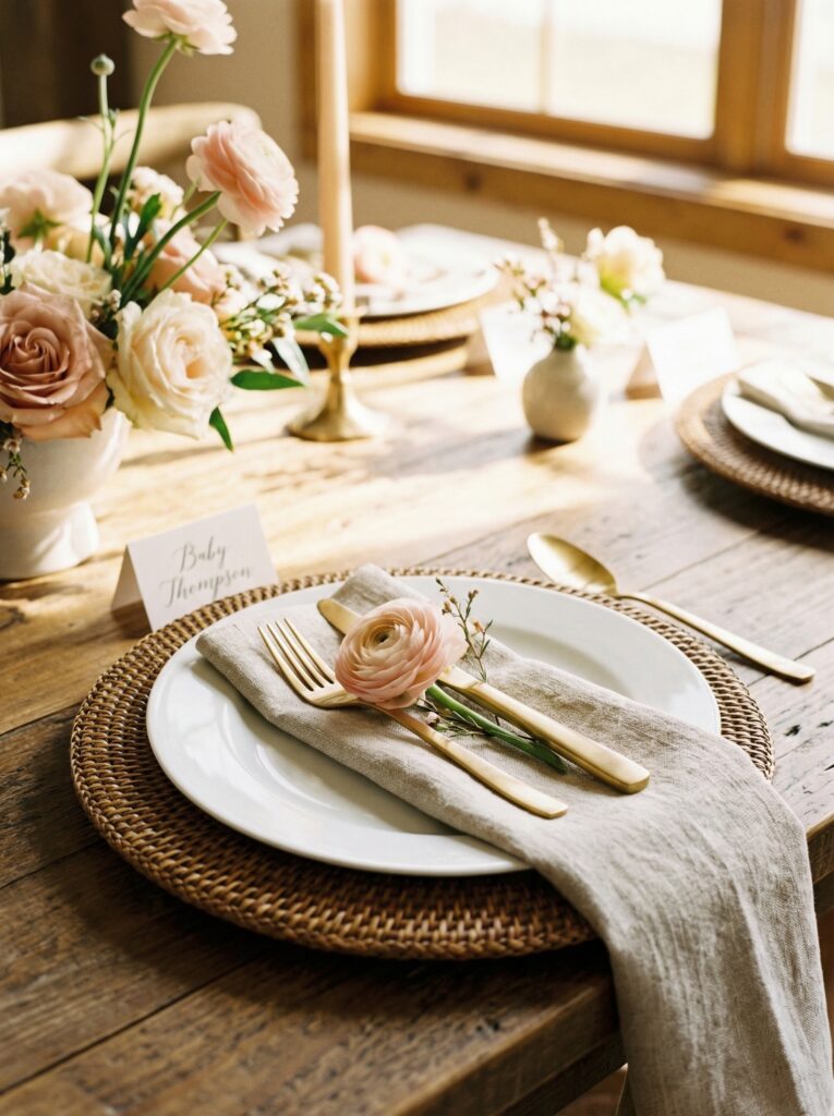 For the baby in bloom table, simplicity in your tableware lets the flowers do the talking. Clean white plates or soft ivory dishes are the perfect backdrop. Pair them with gold or brass flatware for warmth, or simple stainless for a cleaner look. Rattan charger plates work beautifully for an outdoor or boho setting.