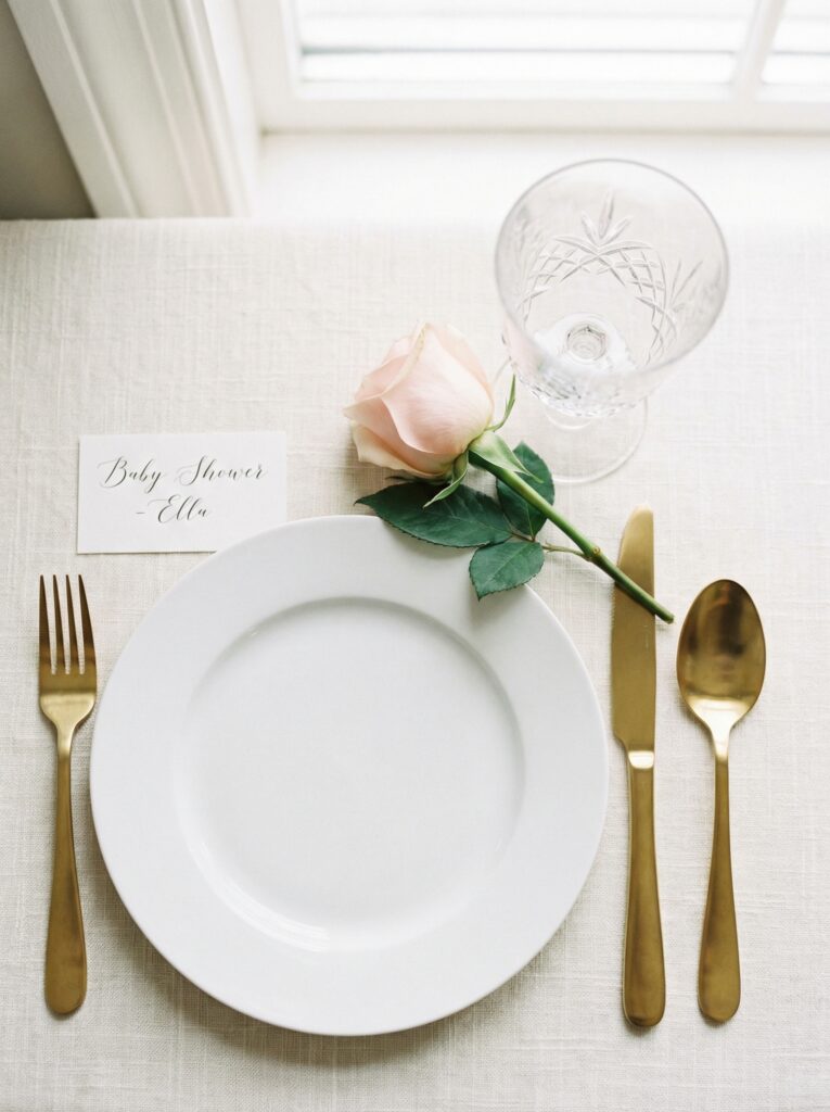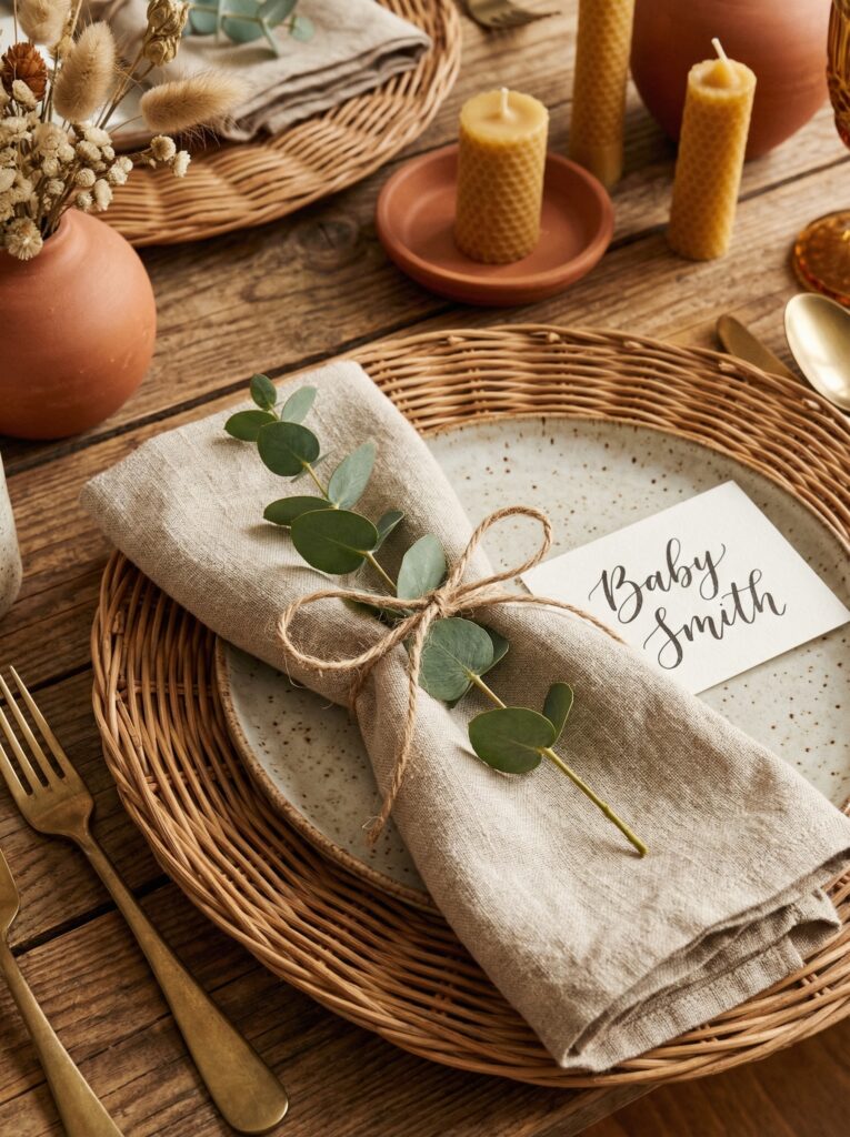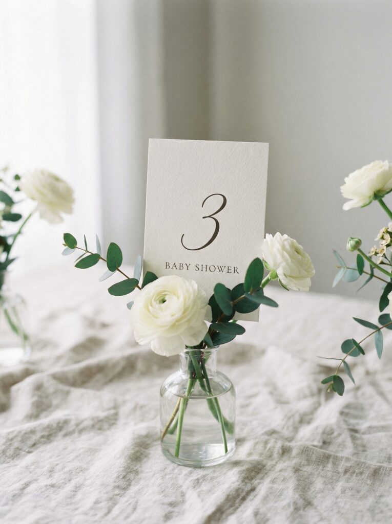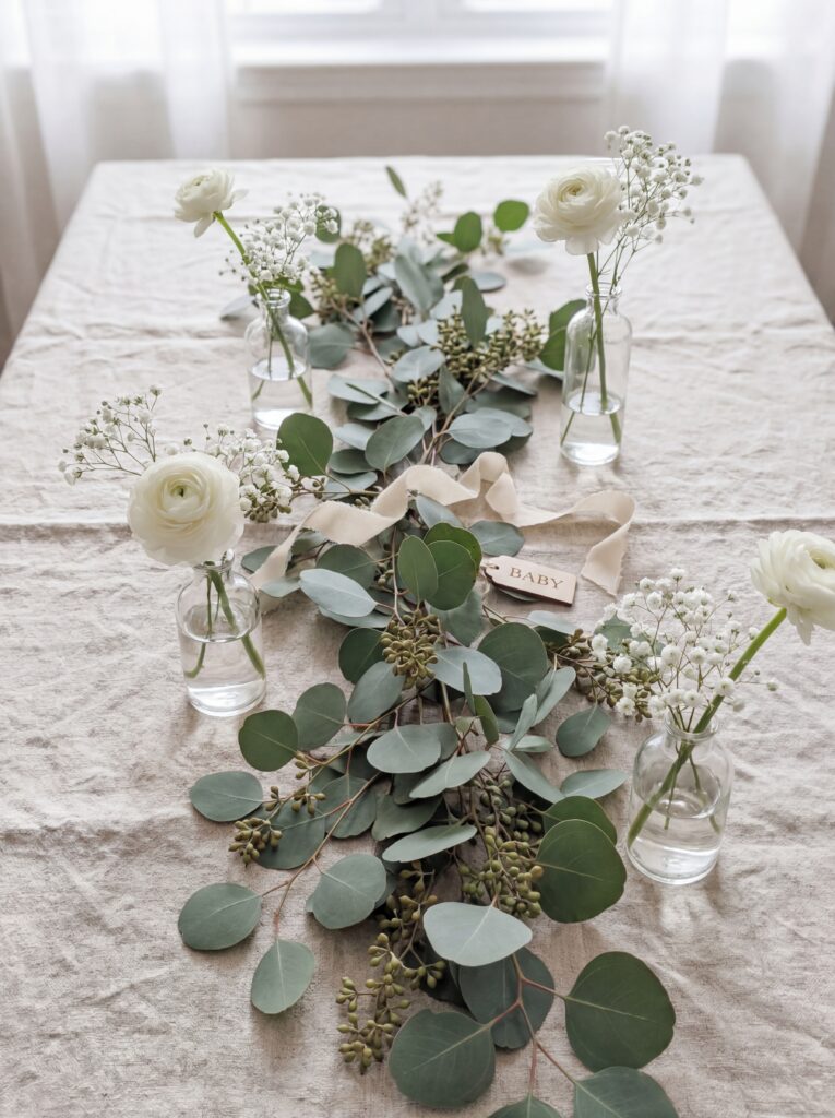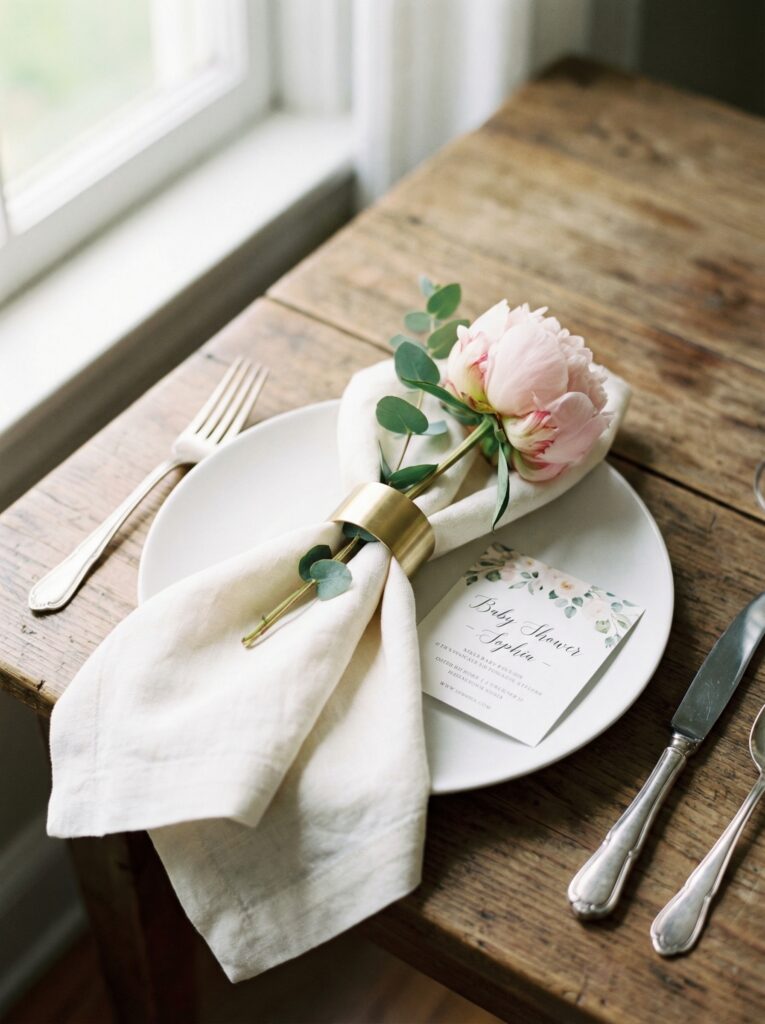 Place cards are a small but meaningful detail. For a baby in bloom table, tuck handwritten name cards into a small bloom or clip them to a sprig of rosemary or eucalyptus at each seat.