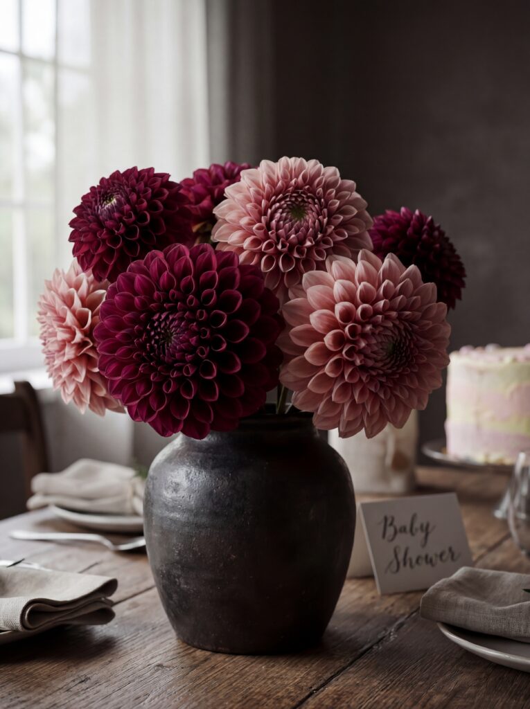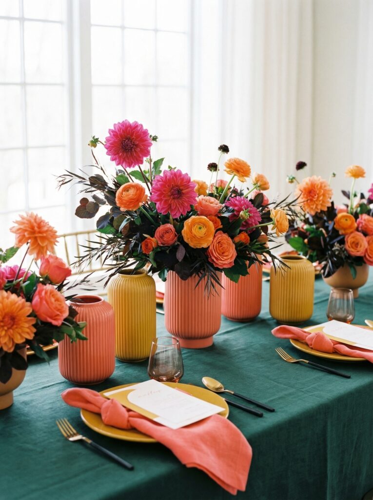 If the mom-to-be has a maximalist or contemporary style, go bold. Coral, mustard yellow, deep burgundy, or vibrant fuchsia paired with forest green and dark foliage creates a table that is dramatic, editorial, and completely Pinterest-worthy.