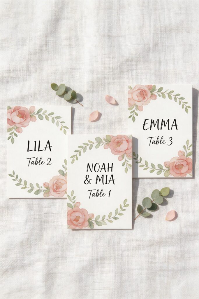 Alternatively, use flat botanical place cards printed with watercolor flowers for a cohesive, polished look that also doubles as a keepsake for guests.