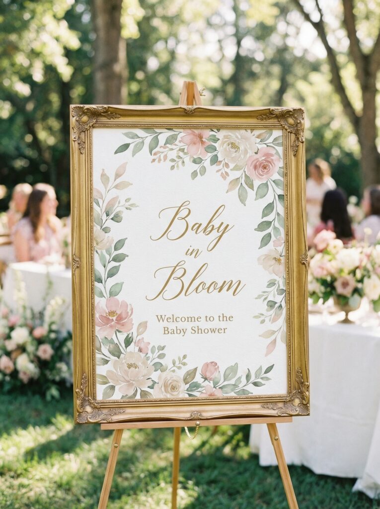 A welcome sign placed on or near the head table anchors the entire space. It does not need to be elaborate — even a simple piece of card stock in a gold frame with floral accents and the words “Baby in Bloom” or “A Little Bloom Is on the Way” does the job beautifully. Etsy has an enormous range of printable options that you can customize and have printed locally within 24 hours.