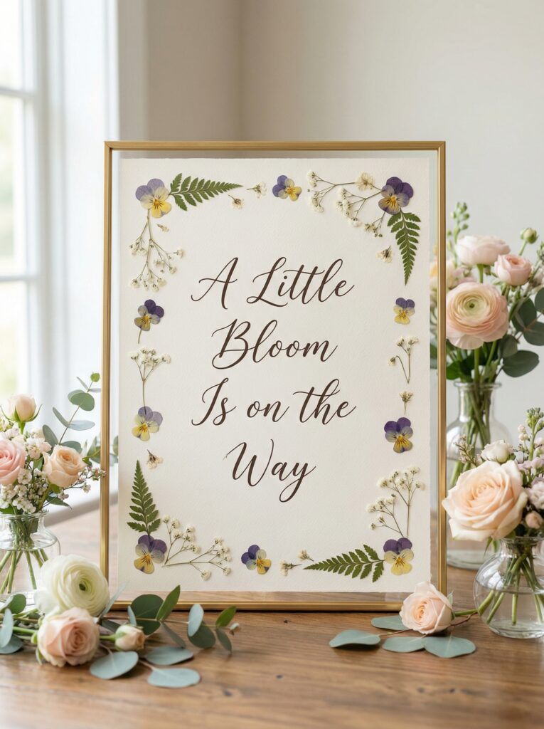 - “A Little Bloom Is on the Way” with the due date or baby name