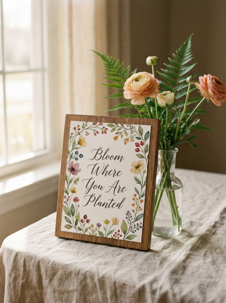 - “Bloom Where You Are Planted” as a table accent sign