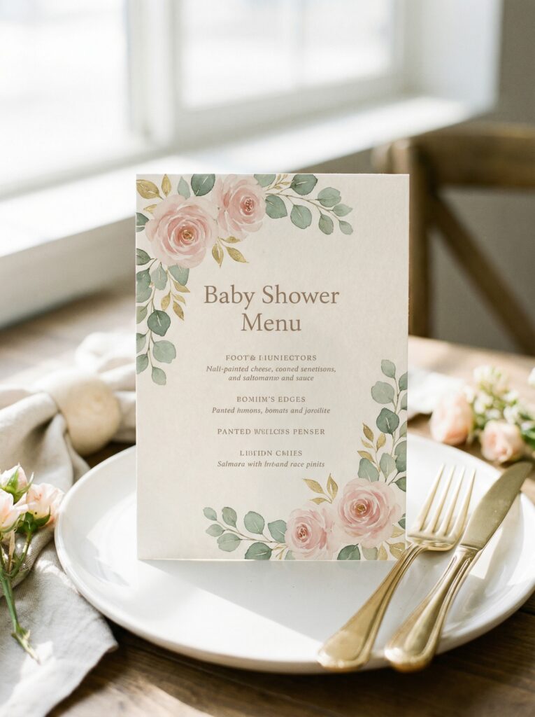 If you are serving a sit-down menu, printed menu cards at each place setting add a formal, restaurant-quality touch that guests genuinely appreciate. Keep the design consistent with your welcome sign — same font, same floral motif, same color palette.