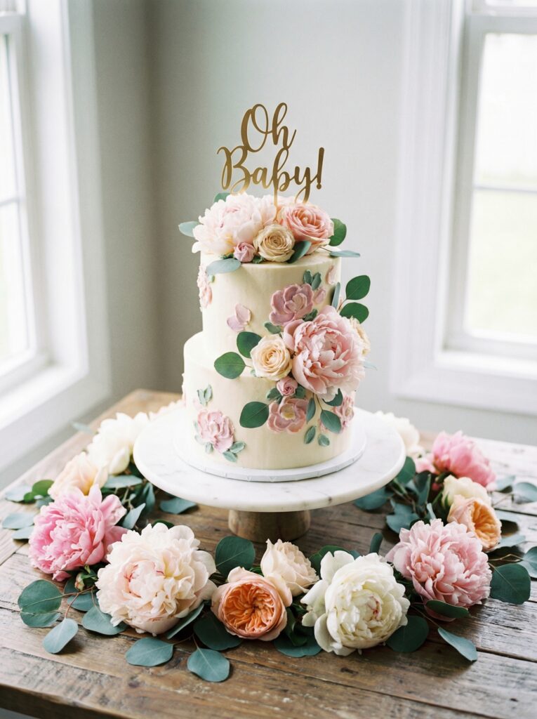 If you are serving cupcakes or decorated cookies alongside the main cake, display them on tiered stands or small risers at varying heights to create a layered effect. Tuck small floral accents between the tiers — a few stems of baby’s breath, individual flower heads, or pressed flower details. This is also where floral-decorated sugar cookies shine: custom cookies shaped like flowers, watering cans, or baby onesies with pastel royal icing are an incredibly popular detail for baby in bloom tables.