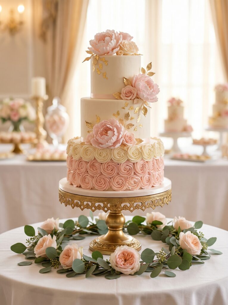 The cake is the hero of the dessert table. Elevate it literally — place it on a tiered cake stand or a sturdy riser — and surround it with fresh blooms in your palette colors. The flowers around the base of the cake do not need to be elaborate: a loose ring of peonies, garden roses, and eucalyptus sprigs placed around the stand creates an instantly luxurious look.