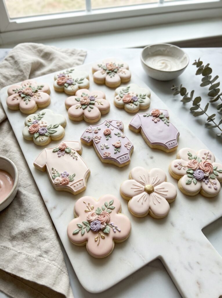 - Flower-shaped cookies with intricate pastel royal icing