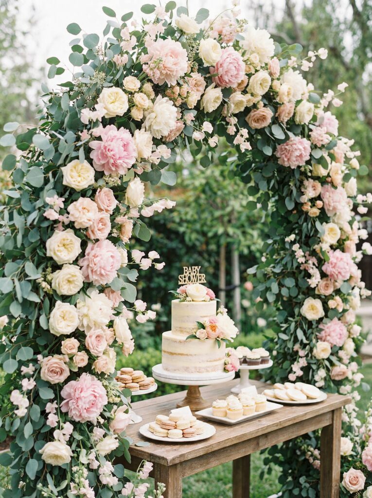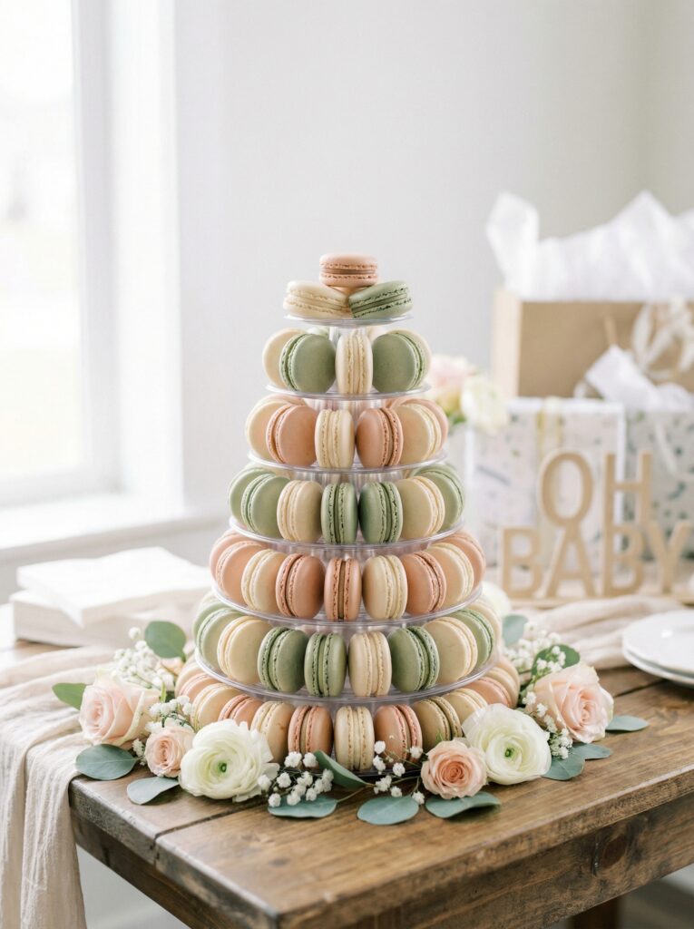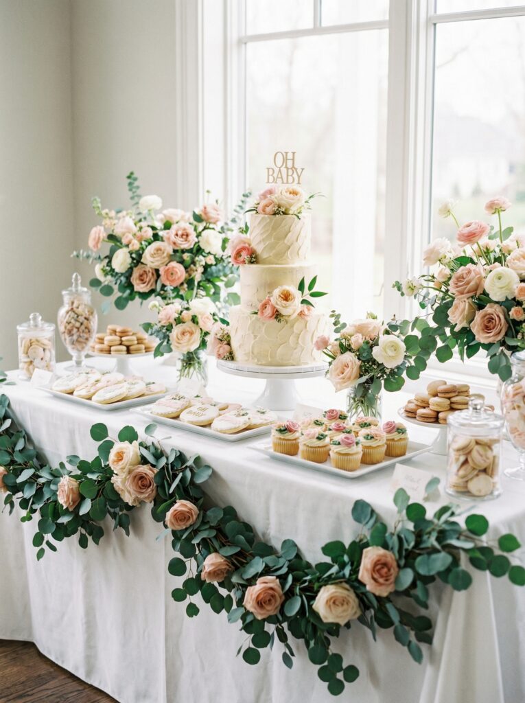 The dessert table is its own moment within the baby in bloom table decor story — and often the most photographed spot at the entire shower. It deserves the same attention as the main dining table, if not more. The goal is to create a display that looks abundant, intentional, and deliciously beautiful.