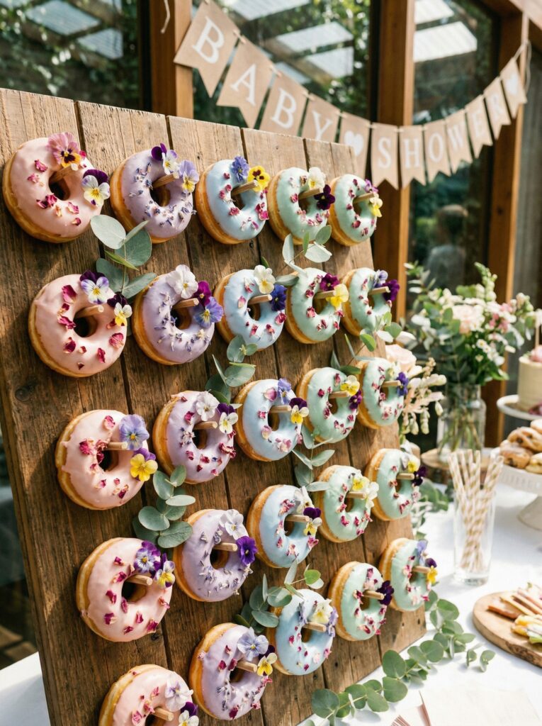 - Floral-topped donuts on a wooden board