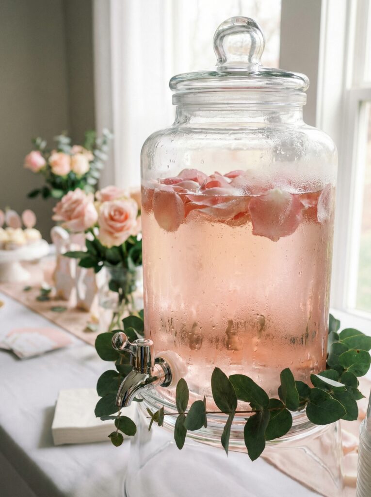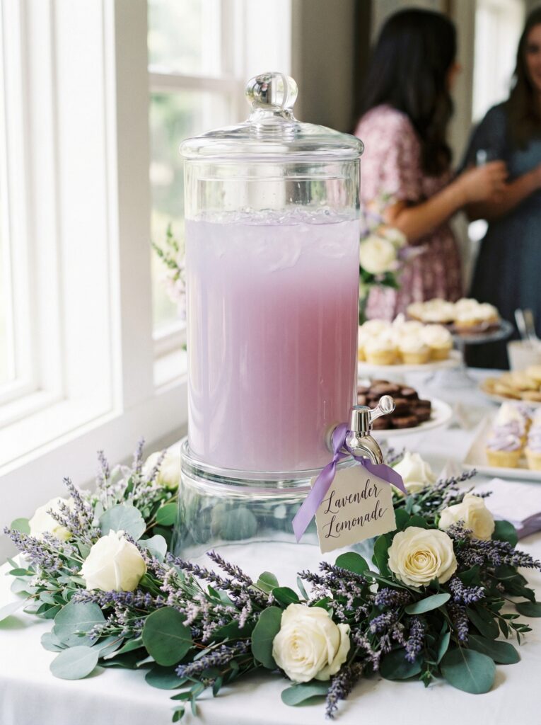 Glass drink dispensers wrapped with floral garland at the base or spout instantly elevate a simple drinks station. Lavender lemonade, rose-infused sparkling water, or hibiscus iced tea in a clear glass dispenser looks stunning — especially when the drink itself is a soft pink or purple hue that ties into your palette. Label each dispenser with a small floral tag.