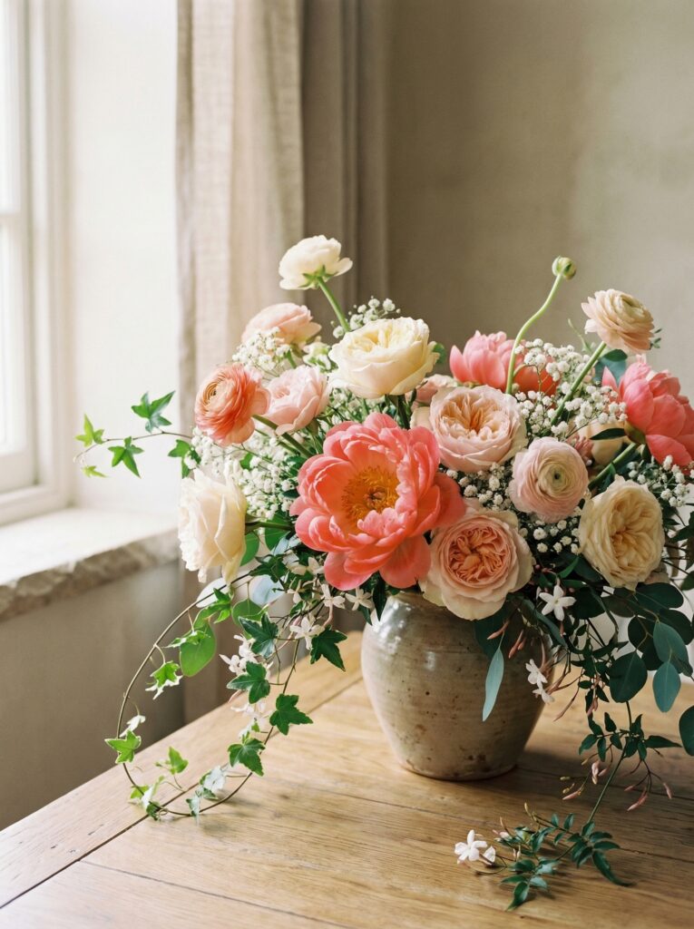 - Trailing stems and loose greenery to soften the arrangement