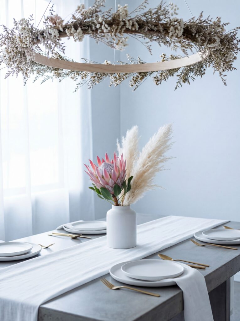 Less is intentionally more. A single oversized arrangement of sculptural blooms — protea, ranunculus, or dried pampas — in a matte ceramic vessel on a clean white or sage linen. Gold flatware, simple white plates, and architectural floral hoop accents. No clutter, no excess. The impact comes from the quality of each element rather than the quantity.