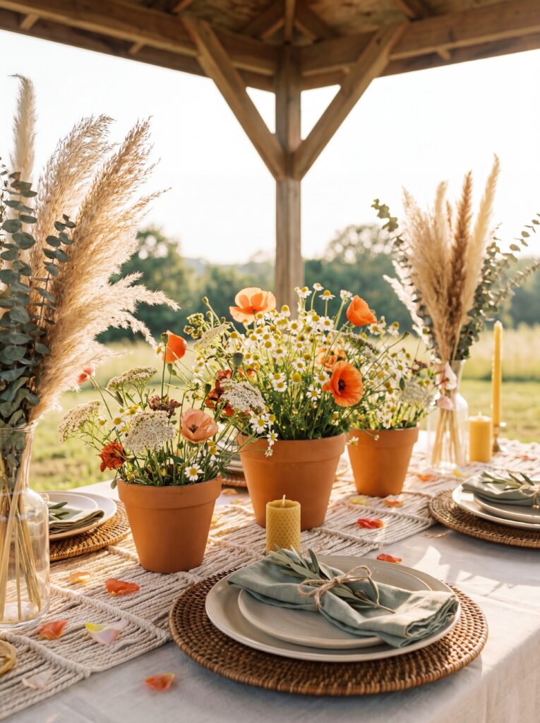 Warm, earthy, and free-spirited. Terracotta pots, rattan chargers, dried pampas grass, and loose wildflower arrangements in a palette of terracotta, cream, and sage. Natural twine wraps the napkins; small potted plants or herb bundles sit at each place. The table feels gathered from nature rather than styled for a magazine — which, paradoxically, makes it incredibly photogenic.