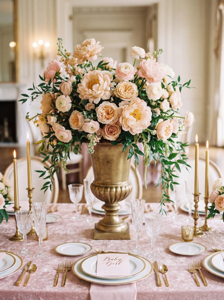 This is the most popular palette for the baby in bloom theme — and the most timeless. Think blush pink, dusty rose, ivory, and sage green. Flowers like peonies, garden roses, and sweet peas are naturals here. The result is a table that feels warm, dreamy, and effortlessly elegant.