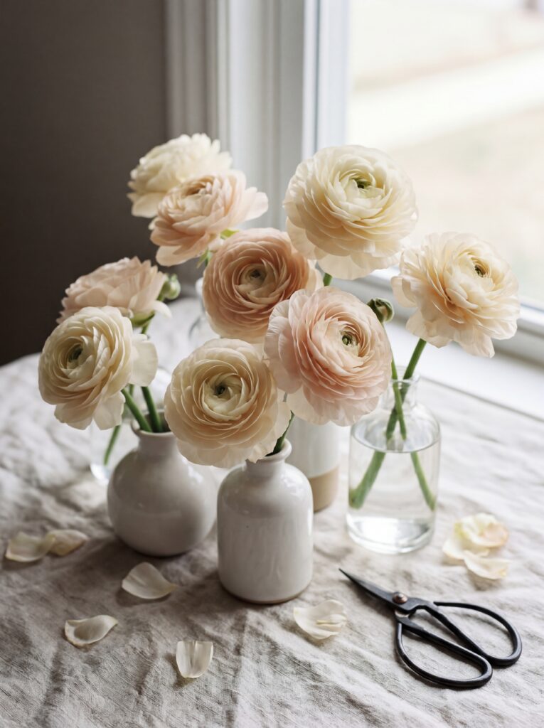 - Ranunculus — layered and delicate, like a peony’s smaller sibling