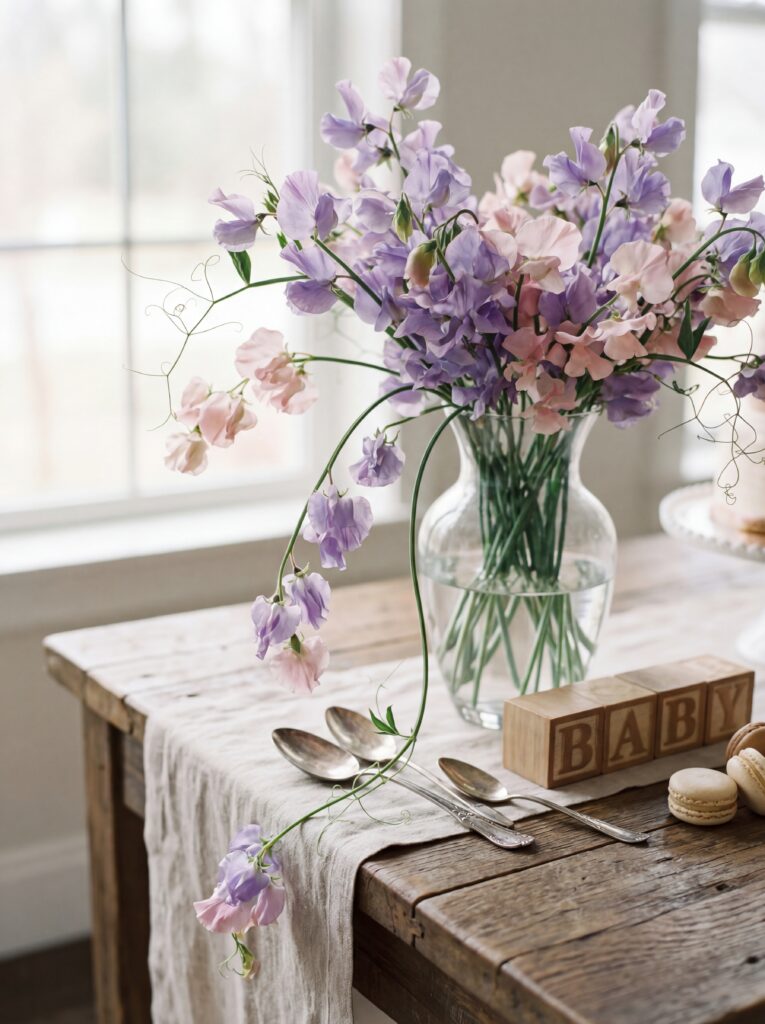 - Sweet peas — trailing and whimsical, in lavender, pink, and white