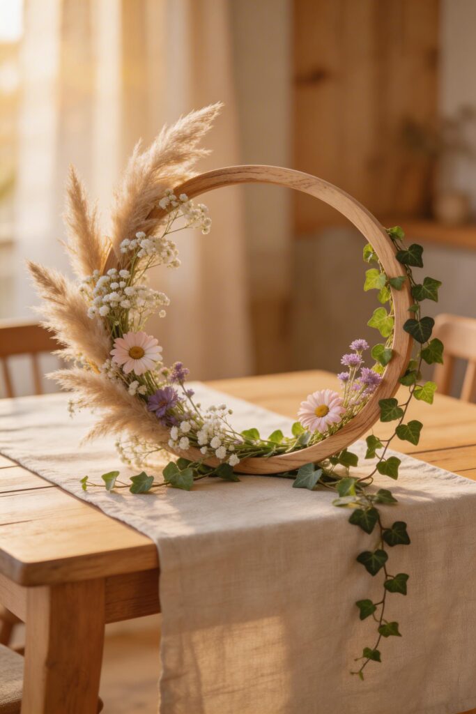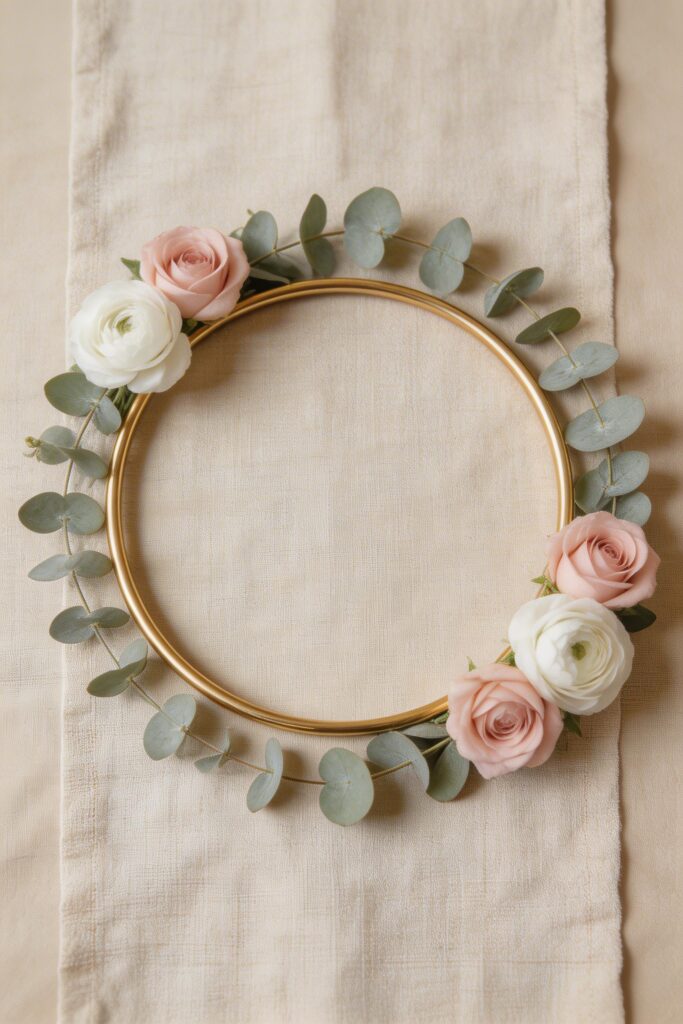 Floral hoops have become a staple of the baby in bloom aesthetic. A wooden or gold metal hoop wrapped with eucalyptus, small blooms, and trailing greenery makes for a sculptural, modern centerpiece that photographs beautifully. Lay it flat on the table or prop it with a small stand for height.