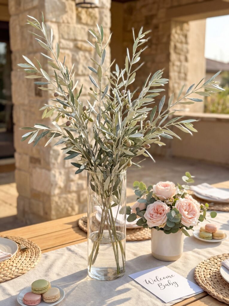 - Olive branch — elegant and Mediterranean, pairs beautifully with blush and cream