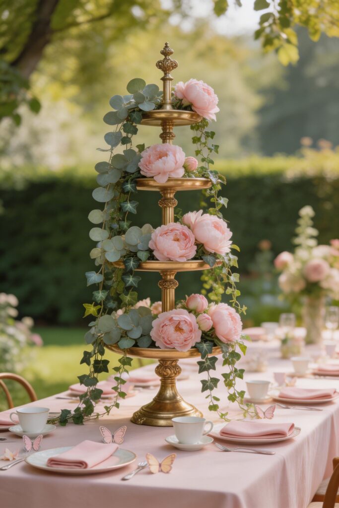 - Tiered cupcake stands with floral accents between levels