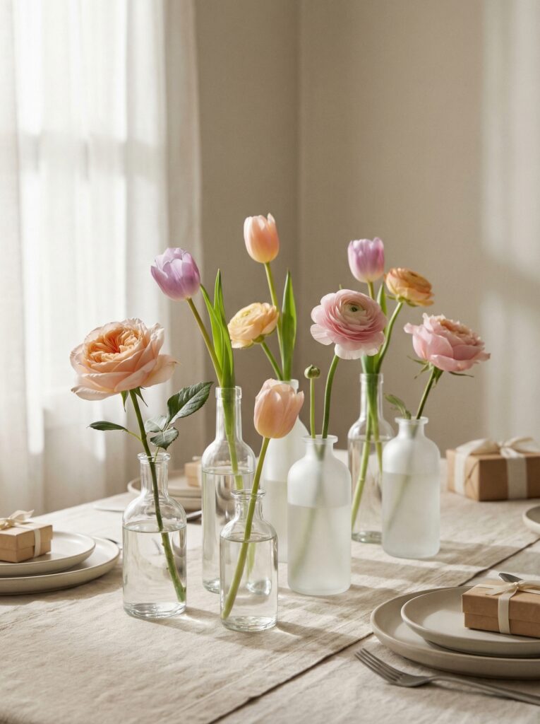 Bud vases are one of the easiest, most budget-friendly ways to create a beautiful baby in bloom table. Cluster three to seven small vases of varying heights down the center of the table, placing a single stem or small cluster in each one. The asymmetry and variation is what makes it look curated rather than sparse.