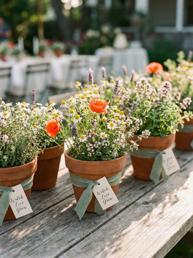 Potted herbs, wildflowers, or small flowering plants make charming centerpieces that double as party favors. Set them in terracotta pots, tie them with ribbon in your palette color, and add a little tag that reads “Watch love grow.” Guests get to take one home — zero waste, maximum charm.