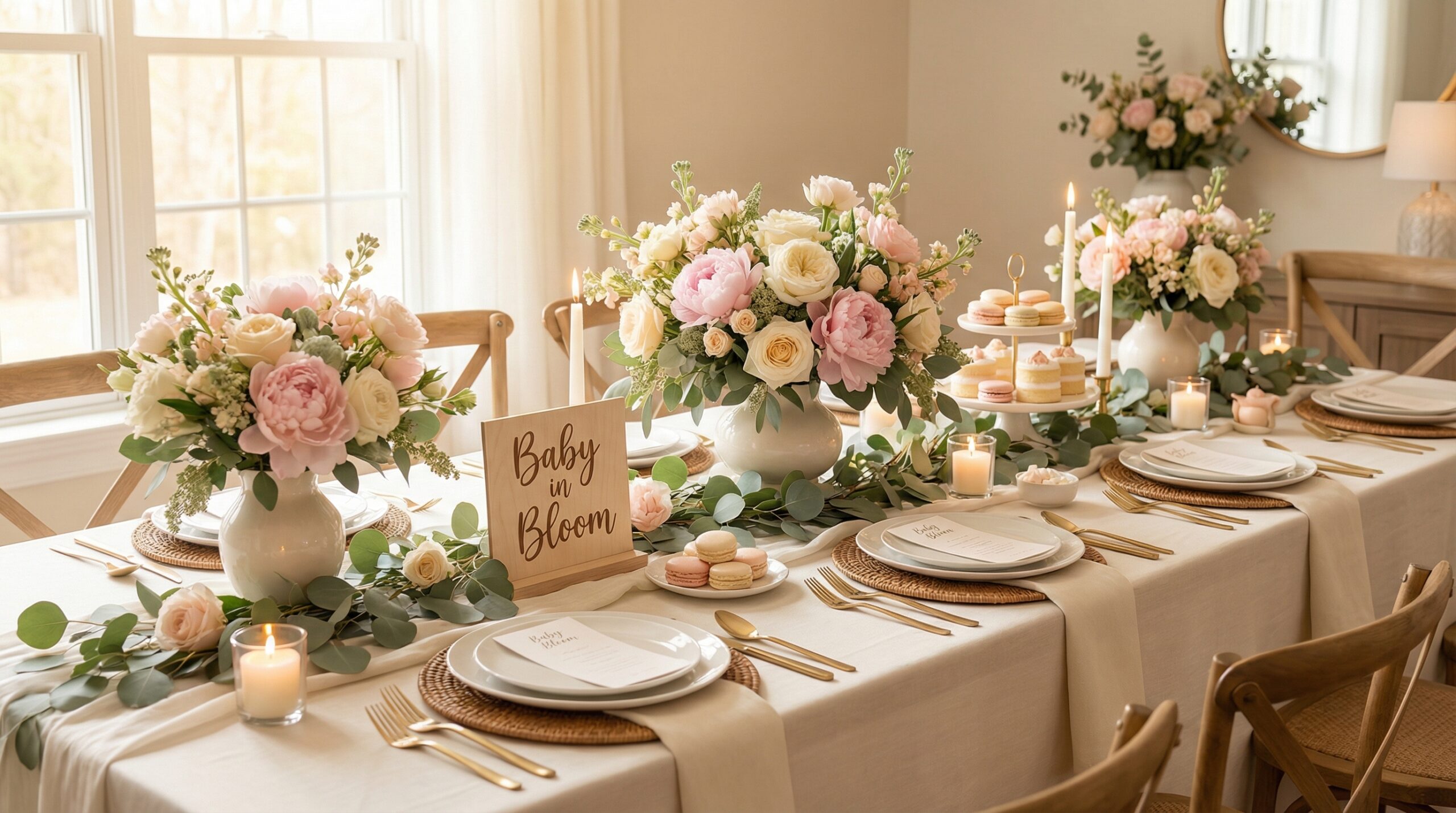 Picture this: guests walk through the door and the table stops them in their tracks. Lush peonies spilling out of bud vases, a soft greenery runner stretching down the center, mismatched pastel blooms tucked into every corner, and a cake surrounded by fresh florals that looks straight off a magazine cover. That is what baby in bloom table decor does when it is done right.