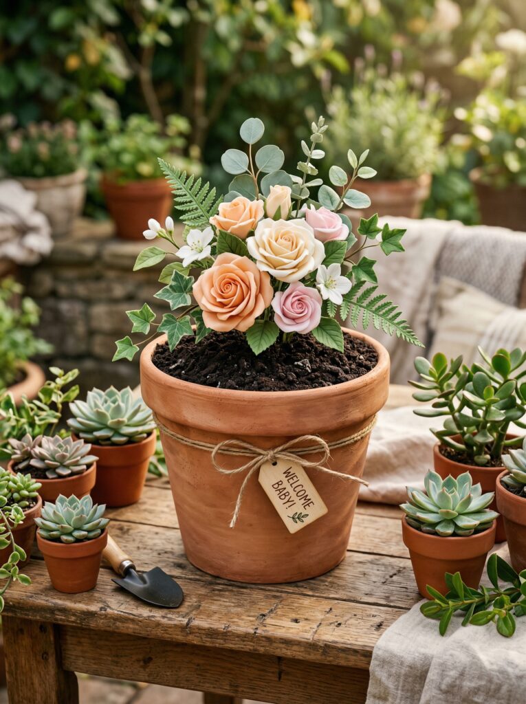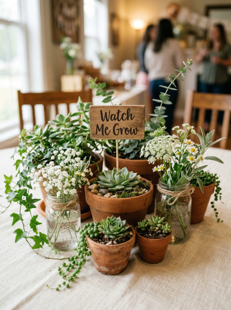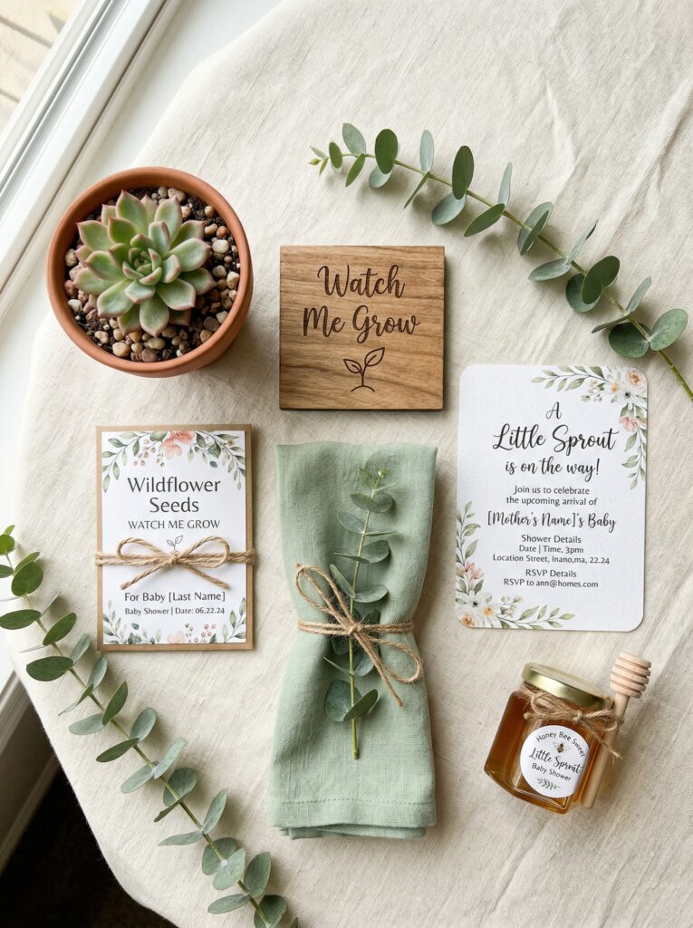 The most loved favors for this theme are small succulents in hand-painted terracotta pots, custom seed packets with the baby’s name and due date, and mini herb growing kits in burlap bags. These all tie directly to the “watch me grow” theme, cost $1.50β$4 per guest, and give guests something genuinely useful to take home β not a candle they’ll forget in a drawer.
