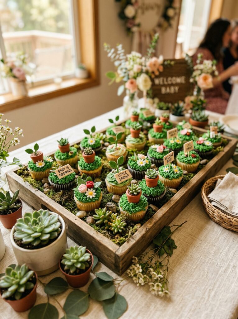 Cupcakes decorated with edible flowers and green “grass” frosting (tinted coconut) provide both visual appeal and practical ease β no cake cutting, no serving, guests simply choose one from the display.
