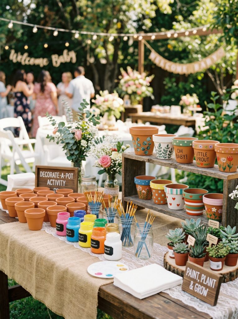 Set out plain 2-inch terracotta pots (about $0.50 each in bulk), acrylic paints, fine brushes, and paint pens. Guests decorate their own pot, then you plant a small succulent inside before they leave. The pot becomes both an activity and a take-home favor β two birds, one seed.