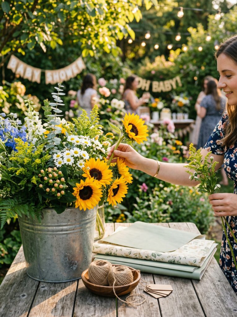 This is one of the most genuinely affordable baby shower themes available, because nature does most of the decorating for you. Here’s how to break it down for a 30-guest shower.