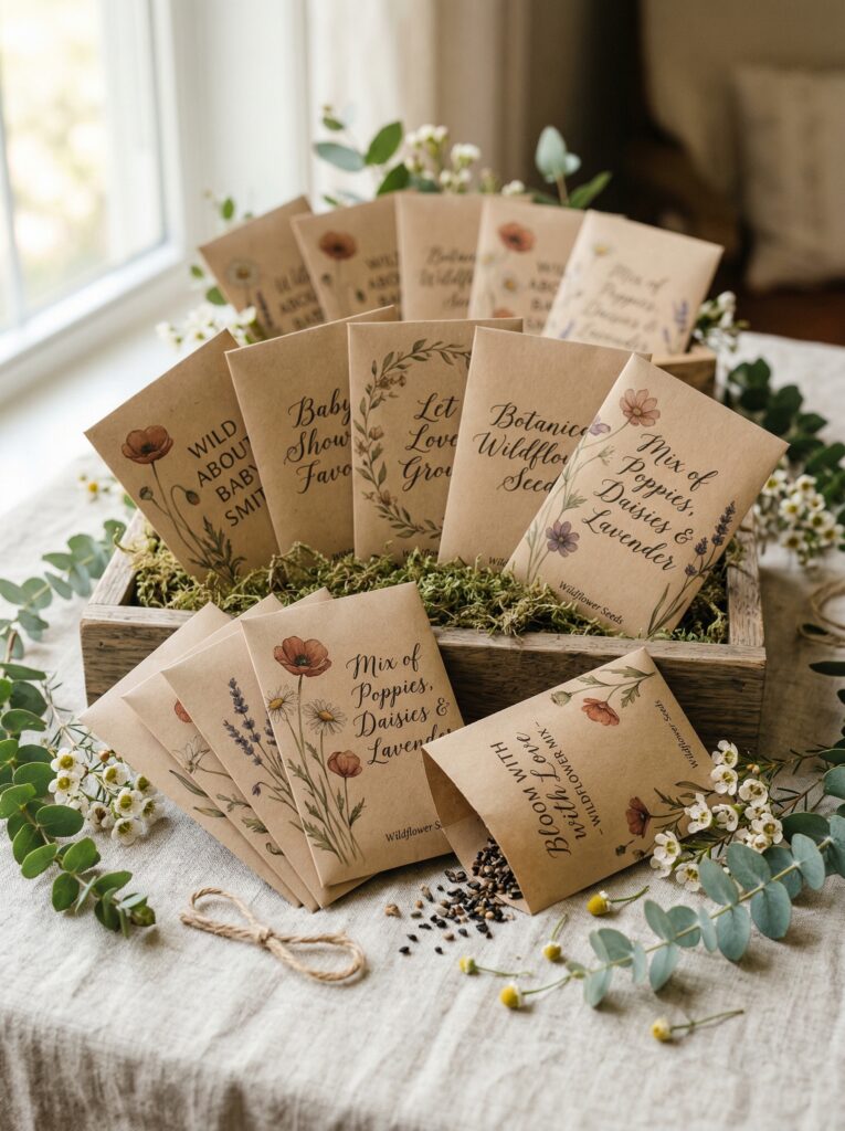 Design labels in Canva with baby’s name and due date. Print on sticker paper, attach to seed packets. Total cost: ~$1.50 per favor.