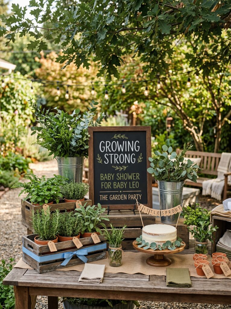 Frame the theme around gardening, exploration, and growing big. Use signage like “Our Little Adventurer Is Sprouting” or “Growing Strong.” Swap flower-heavy centerpieces for potted herbs, succulents, and small trees or ferns.