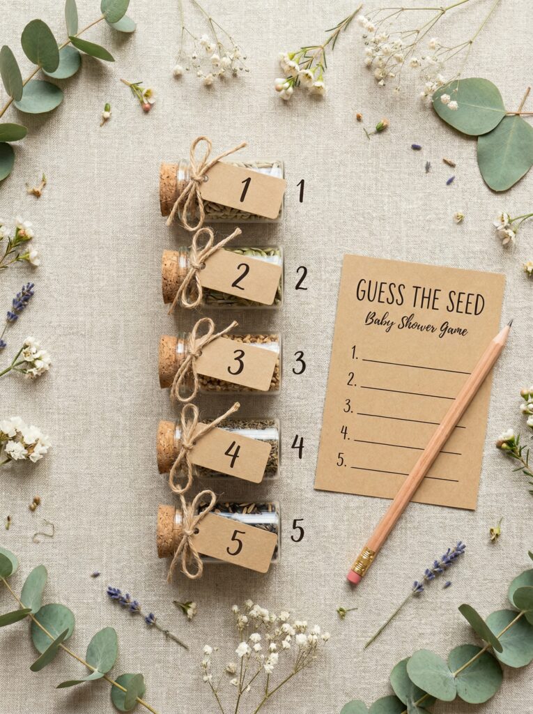 Place different seeds in small numbered glass jars and have guests identify what each one grows into β tomato, sunflower, pumpkin, watermelon, basil. Whoever gets the most right wins a small succulent or seed kit. This game is interactive, theme-perfect, and generates real conversation.
