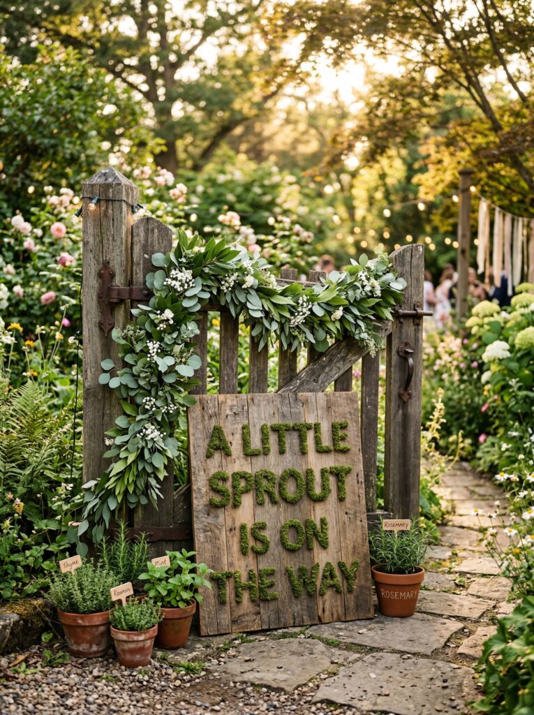 - Chalkboard sign reading “Little Sprout Market” or “Watch [Baby Name] Grow” in elegant script