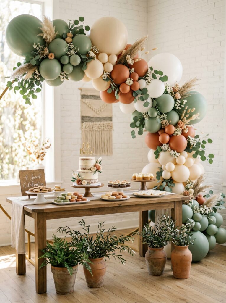 - Use sage green, cream, terracotta, and soft white balloons