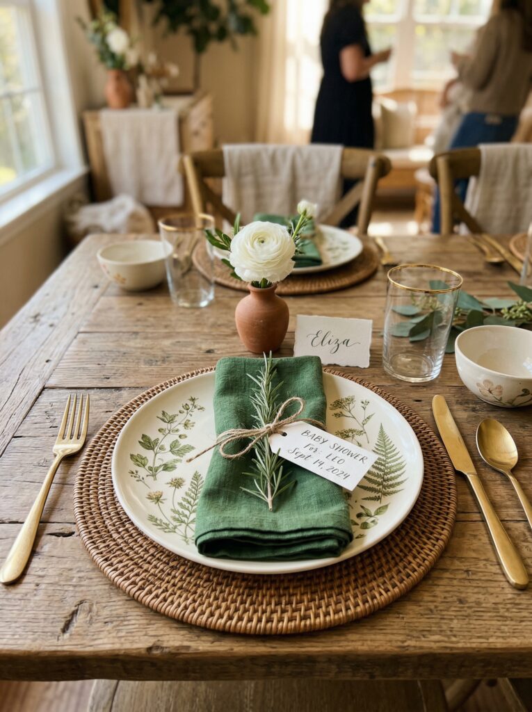 - Green linen or cotton napkins tied with natural jute twine, with a small sprig of greenery tucked in