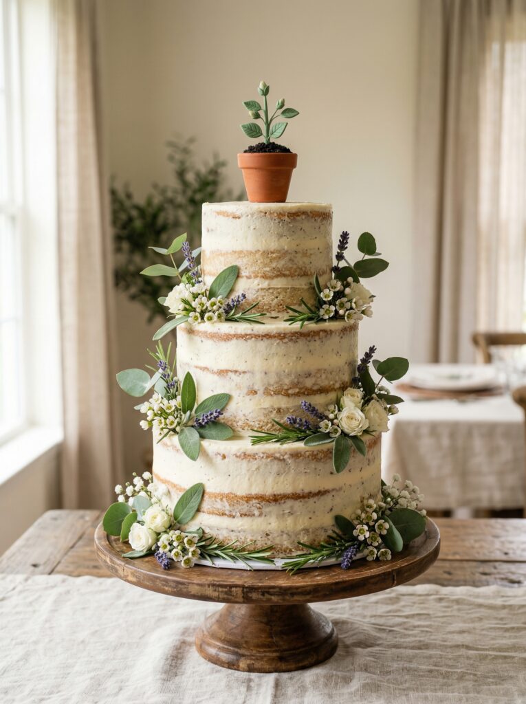 Trendy, affordable, and beautiful. A grocery store two-tier cake (~$40) elevated with pesticide-free fresh flowers and sprigs of rosemary or lavender.